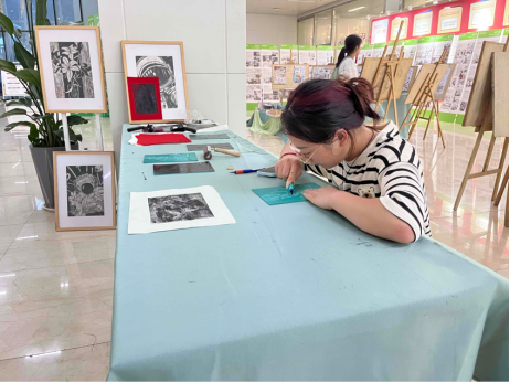 本次展览体现了专业教师团队不仅传授专业知识和技能,更注重培养员工的创新思维和实践能力。同时,展览期间,公司版画社团的志愿者们还设计了现场刻版送装饰画的活动,吸引了众多员工与老师关注和参与,形成了一个良好的学术氛围和交流平台。
